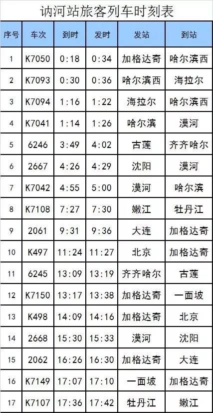 訥河火車站部分列車班次參考