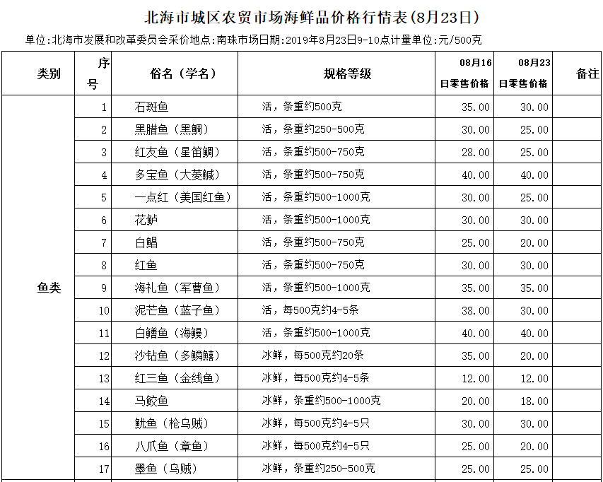 北海最新海鮮價格表
